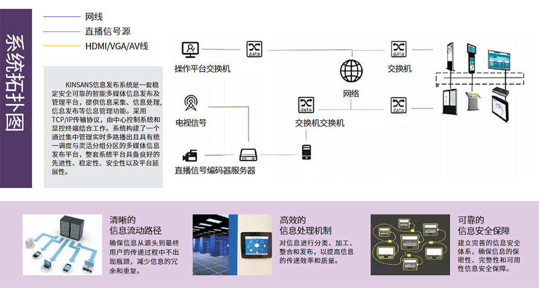 KINSANS信息發(fā)布系統(tǒng)是一套穩(wěn)定安全可靠的智能多媒體信息發(fā)布及管理平臺(tái),提供信息采集、信息處理, 信息發(fā)布等信息管理功能。采用TCP/IP傳輸協(xié)議,由中心控制系統(tǒng)和顯控終端結(jié)合工作。系統(tǒng)構(gòu)建了一個(gè)通過(guò)集中管理實(shí)時(shí)多路播出且具有統(tǒng)一調(diào)度與靈活分組分區(qū) 的多媒體信息發(fā)布平臺(tái),整套系統(tǒng)平臺(tái)具備良好的先進(jìn)性、穩(wěn)定性、安全性以及平臺(tái)延展性。